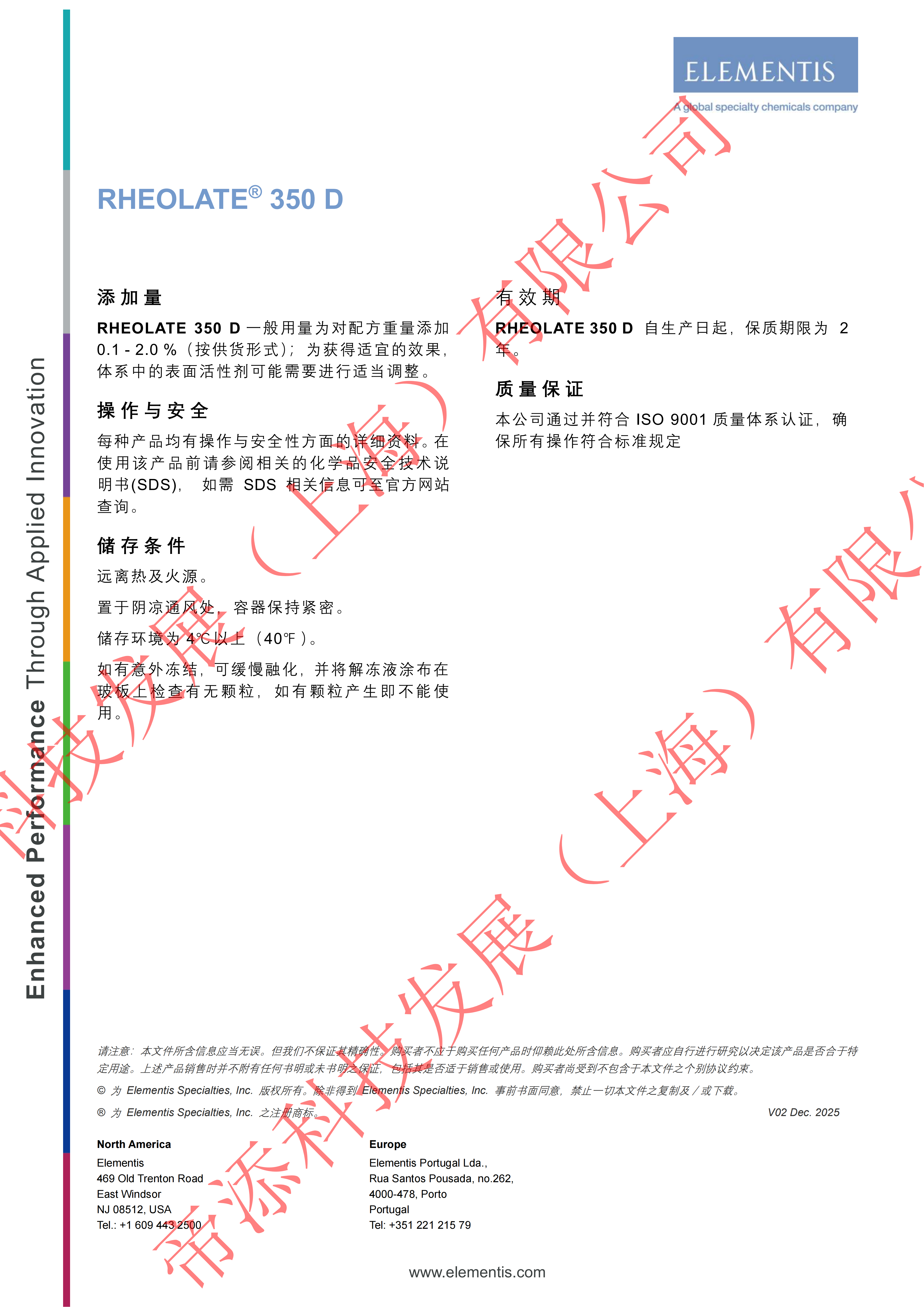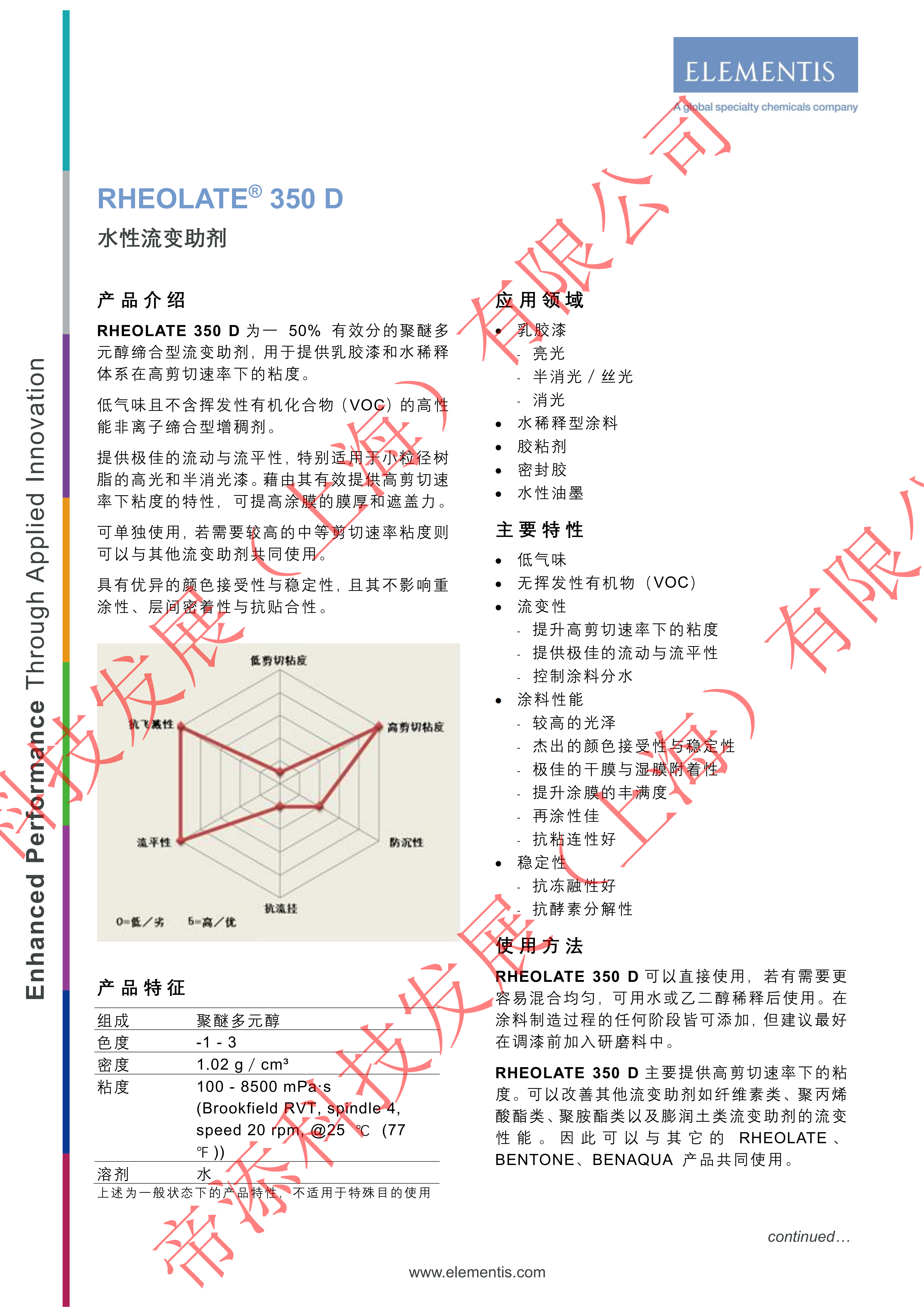 RHEOLATE 350 D 为一 50% 有效分的聚醚多 元醇缔合型流变助剂,用于提供乳胶漆和水稀释 体系在高剪切速率下的粘度。 低气味且不含挥发性有机化合物(VOC)的高性 能非离子缔合型增稠剂。 提供极佳的流动与流平性,特别适用于小粒径树 脂的高光和半消光漆。藉由其有效提供高剪切速 率下粘度的特性,可提高涂膜的膜厚和遮盖力。 可单独使用,若需要较高的中等剪切速率粘度则 可以与其他流变助剂共同使用。 具有优异的颜色接受性与稳定性,且其不影响重 涂性、层间密着性与抗贴合性。